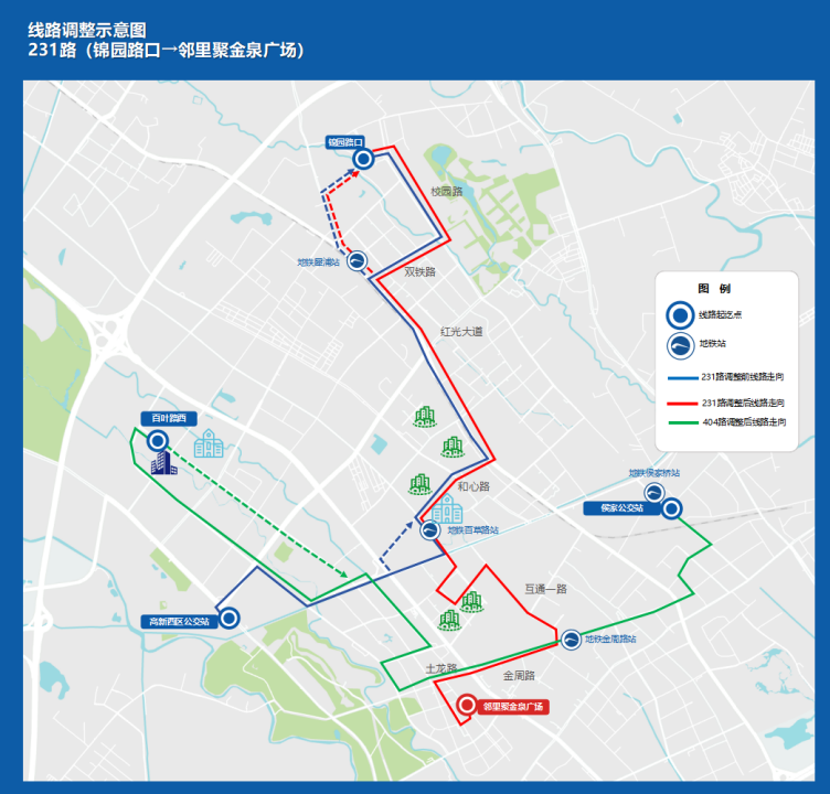 为强化何家社区公交覆盖,拟将311路、231路起讫点调整至邻里聚金泉广场,强化公交地铁接驳,方便周边居民生活出行。