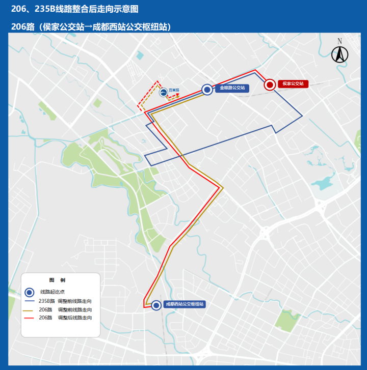 为方便侯家花园、中海国际沿途居民前往成都西站,拟整合206路、235B路,优化后线路代码为206路,同步将线路起讫点调整至侯家公交站,高峰发车频率缩短至5-6分钟。