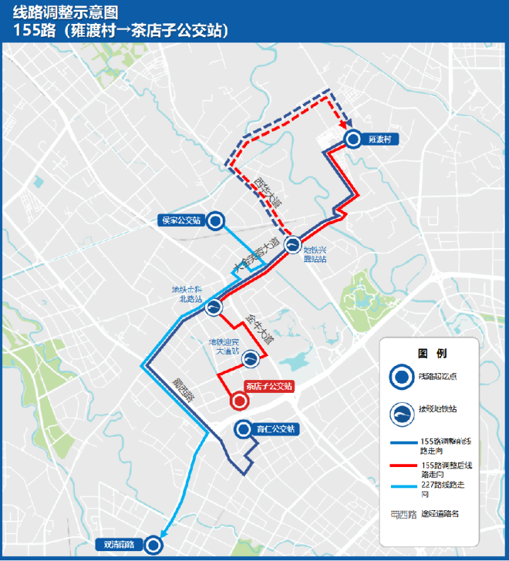 为强化两河片区与地铁2号线、6号线的公交接驳,拟将155路起讫点调整至茶店子公交站,高峰发车频率缩短至5-6分钟。