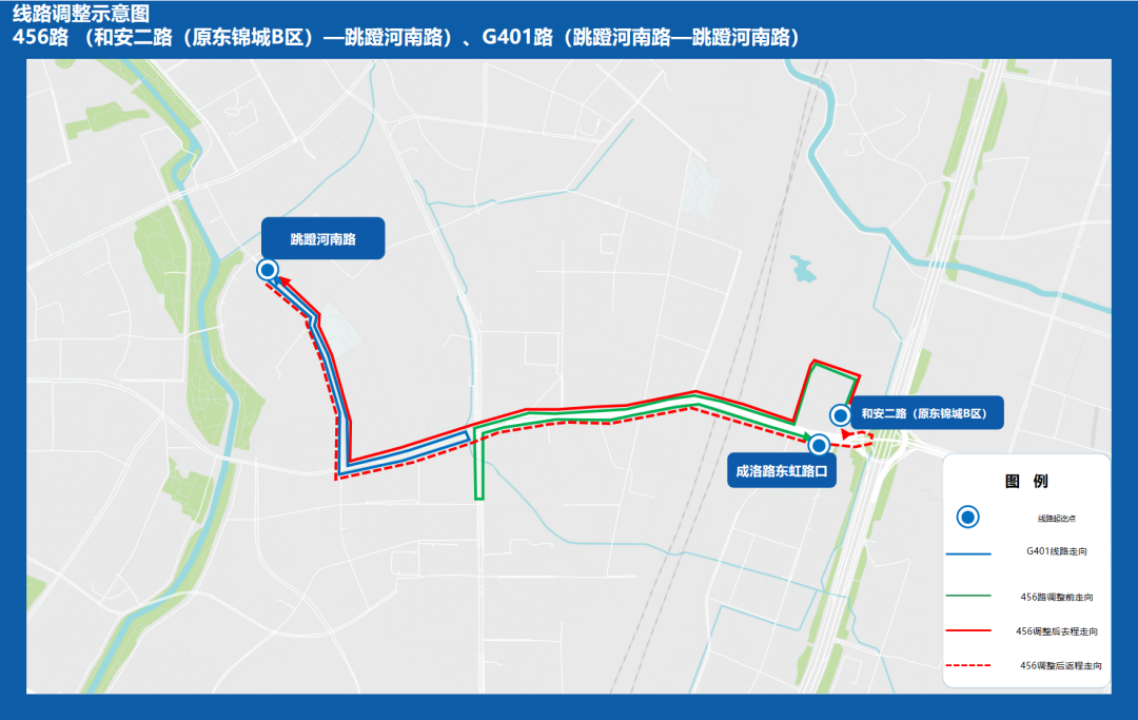 为强化槐树店片区与成洛路公交衔接,减少市民换乘次数,提升出行效率,拟整合456路、G401路,优化后线路代码为456路,同步将线路起讫点调整为和安二路—跳蹬河南路。