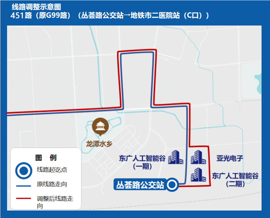 为方便东广人工智能谷、亚光电子等企业员工通勤,拟优化G99路走向,线路编码同步调整为451路,优化后线路往返途经成益路、月华路、成业路再回原线行驶。