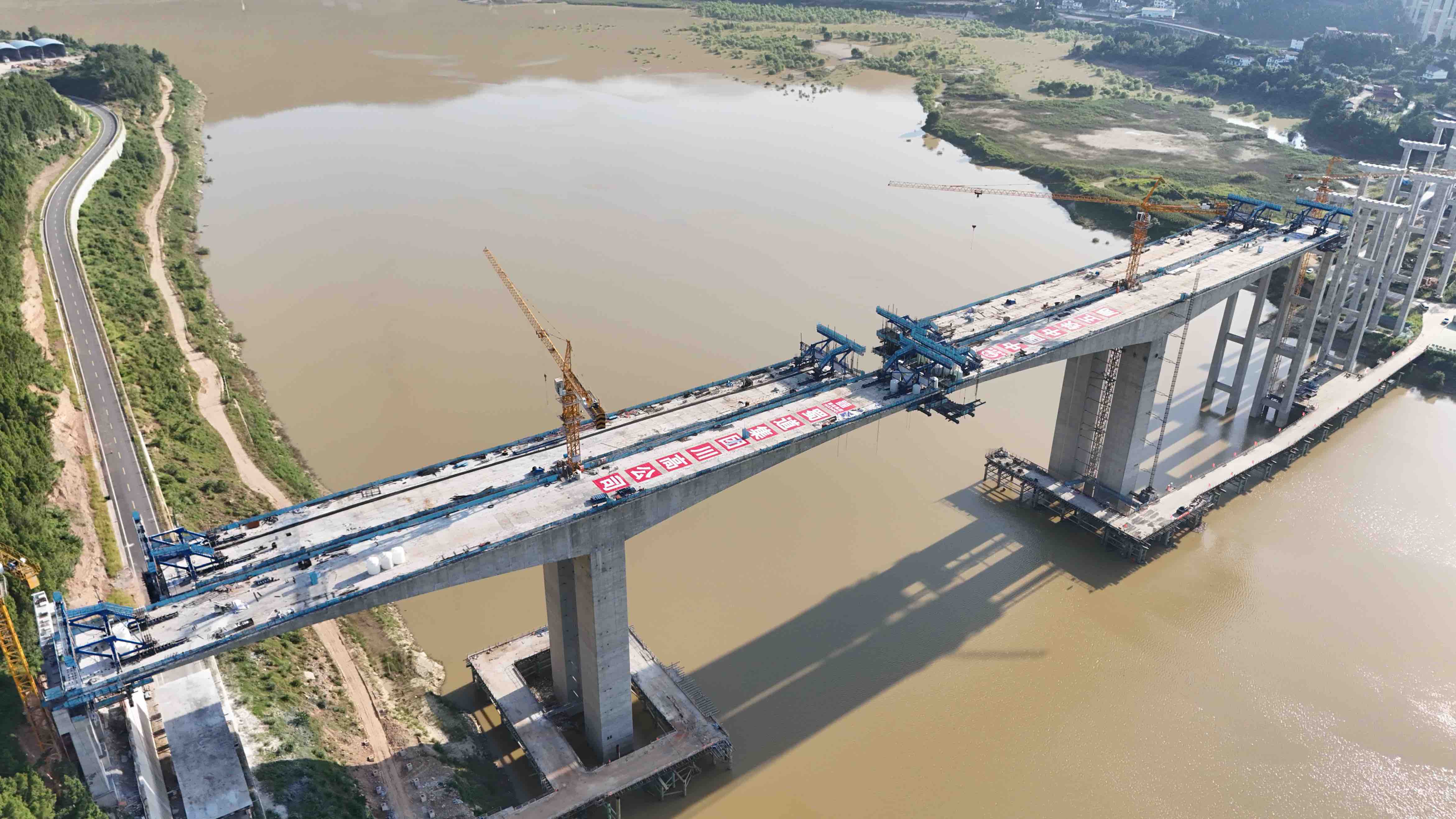 嘉陵江特大桥位于广元市昭化区红岩镇,全长1555米,桥位地势险峻,高墩密布,主墩平均高度为71.9米,主跨采用(95+180+95)米的连续刚构,是广绵扩容项目中的“最长桥”,也是全线重难点控制性工程之一。