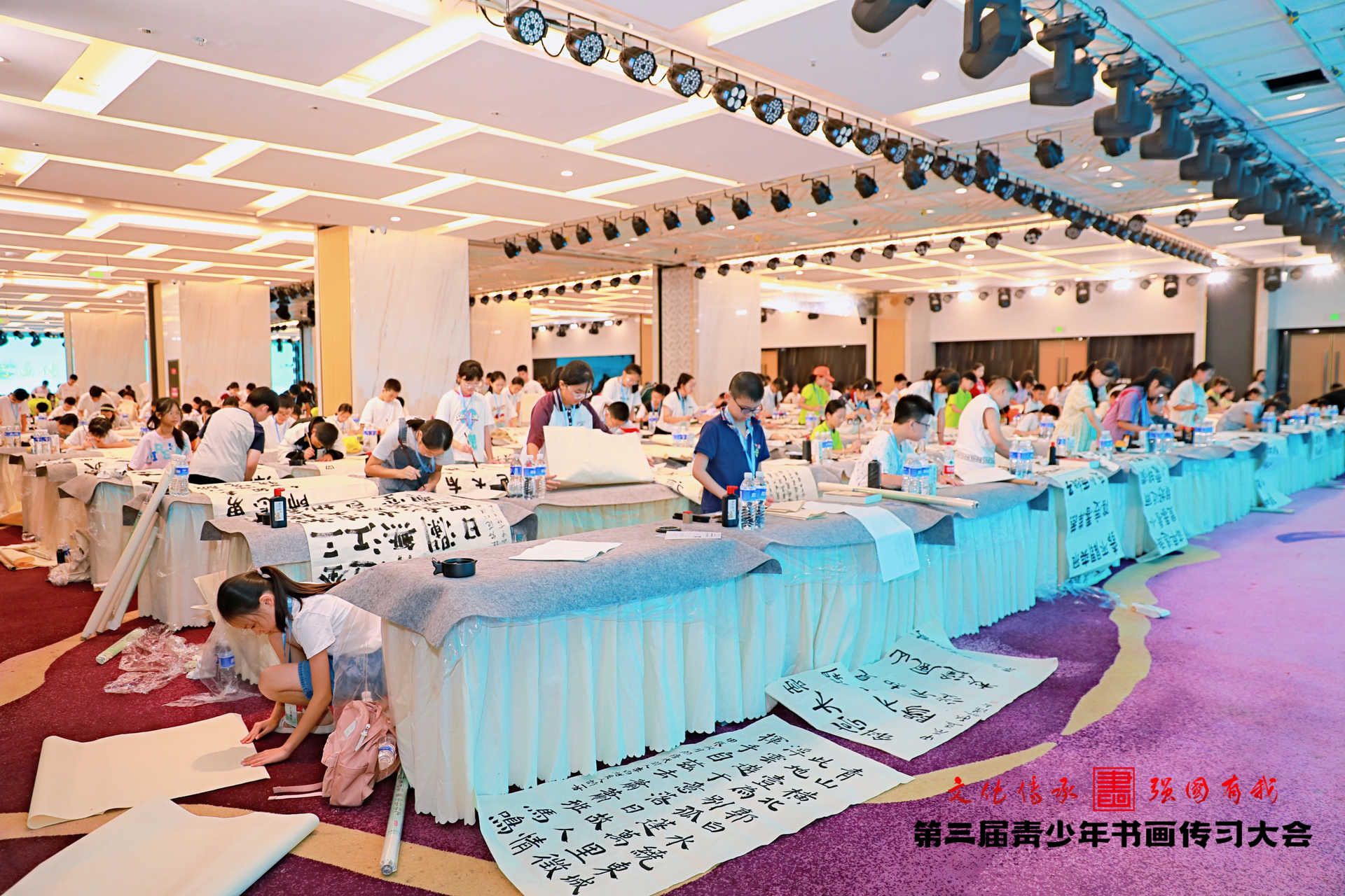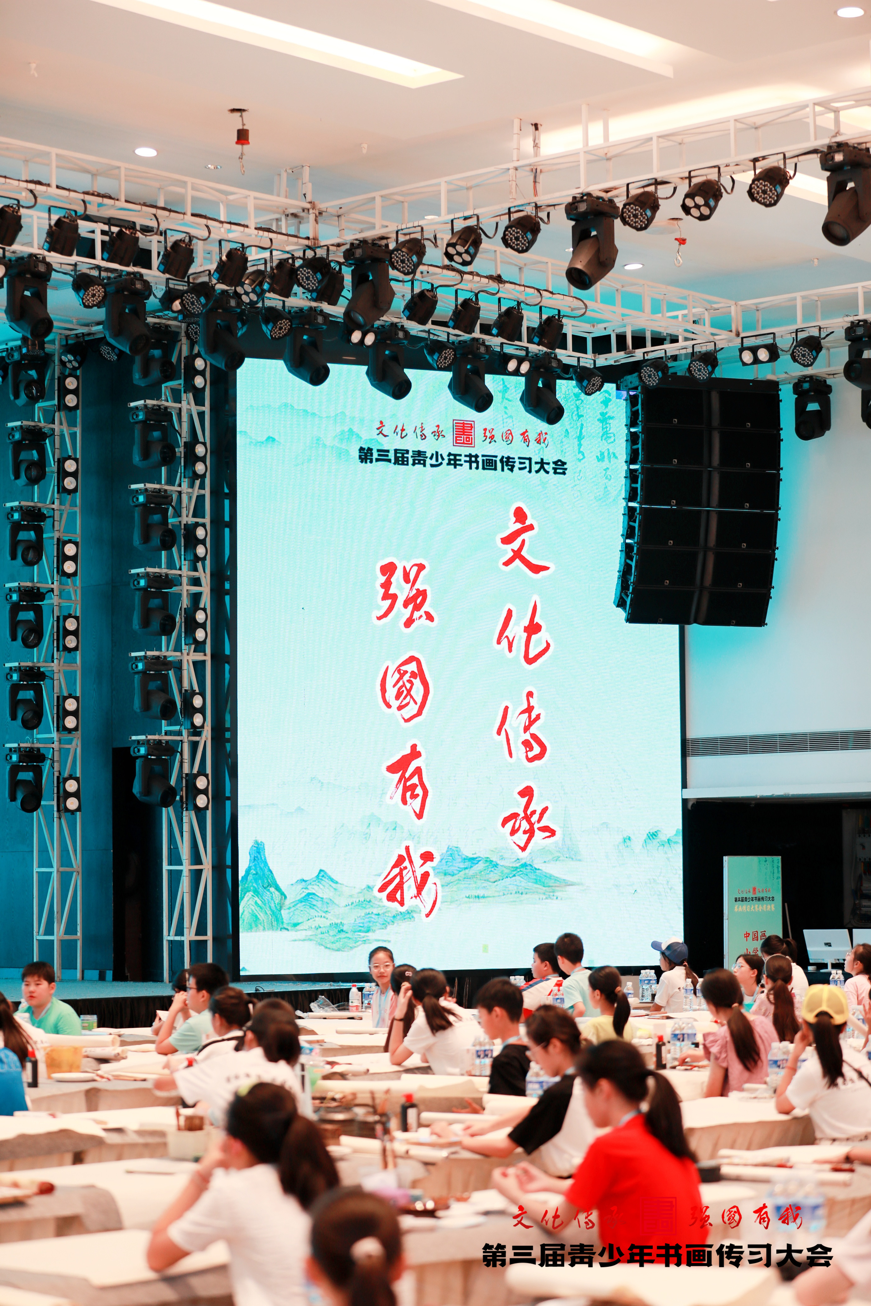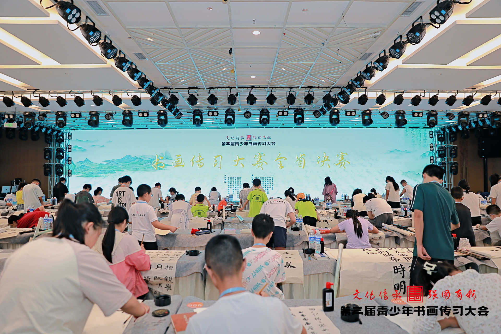 中国书法比赛现场,参赛者们笔触如飞,沉稳有力,横竖撇捺间,或大气刚劲、或飘逸隽秀的汉字呈现在宣纸上,现场的空气中弥漫着笔意激起的淡淡墨香。中国画比赛现场,选手们泰然自若,通过笔触的轻重、疏密、快慢,形成画面的节奏感,跃然于纸上的是光影和空间的美感,是少年的胸怀与气魄。