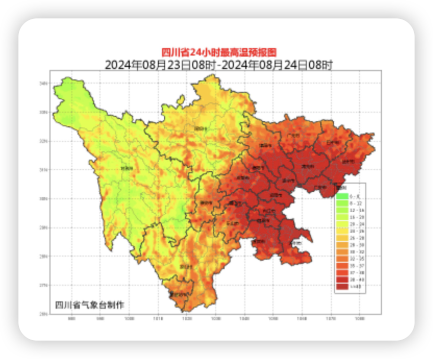 据四川省气象台消息,处暑已过,但暑气未消,未来三天:盆地大部以晴热天气为主,最高气温可达35~39℃,东部、南部的部分地方可达40℃或以上;盆地西部沿山以及攀西地区南部有分散降雨或雷雨。24小时内,盆地最高气温:西部35~39℃,其余地方39~41℃;最低气温:25~28℃。