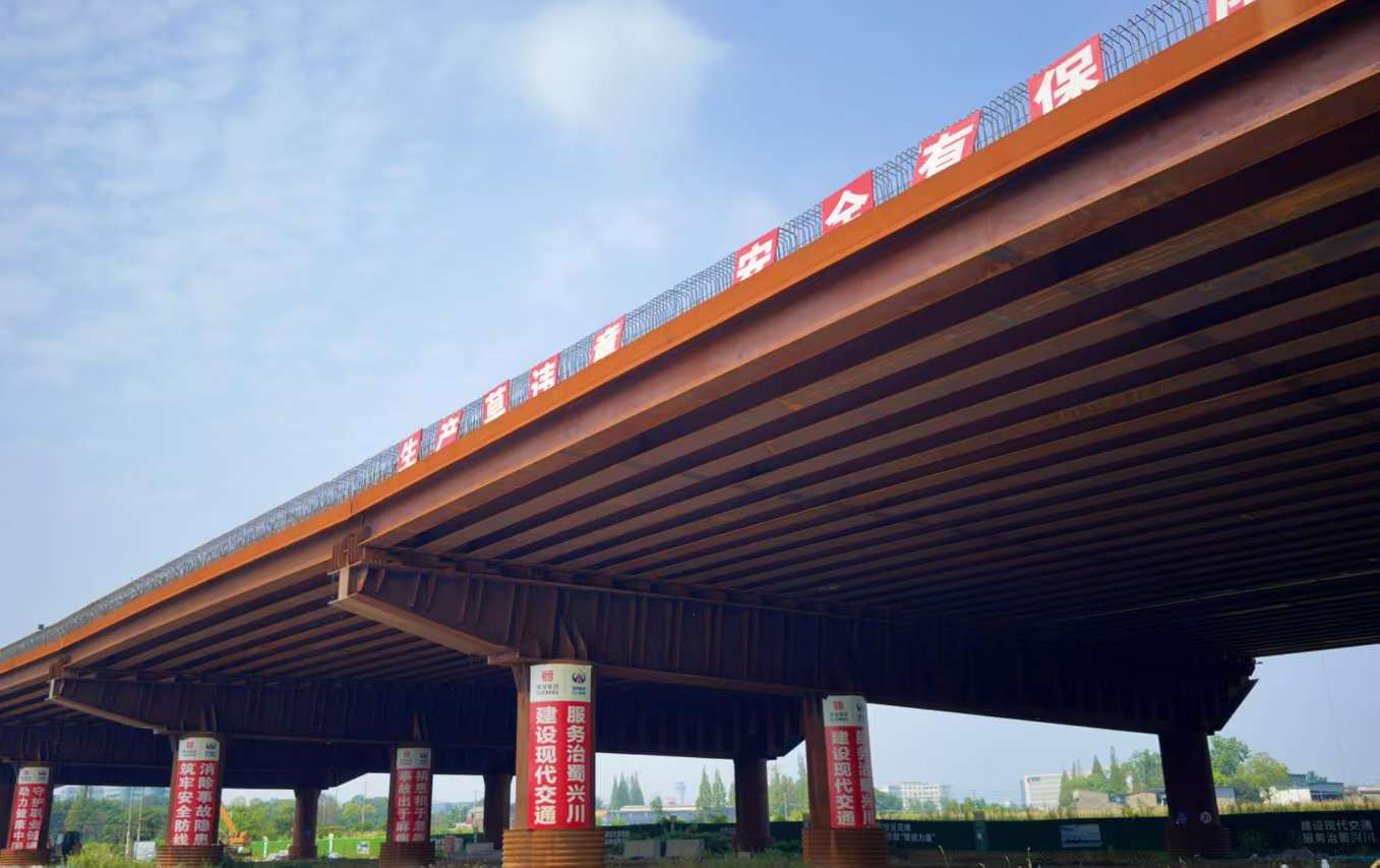 成乐扩容项目入城段全长25.4公里,设计速度120公里/小时,为双向八车道,穿越成都市武侯区、双流区、新津区等城市建成区,沿线人口密集、环保要求高、施工条件复杂。为减少项目施工对沿线居民和周围环境的影响,入城段桥梁全部采用国际首创“密梁式型钢-混凝土组合结构”,耐候钢总用量超30万吨,为目前世界规模最大的耐候钢桥梁应用项目。相较于传统钢筋混凝土桥梁施工方案,该结构具有工业化建造水平高、现场作业量少、施工速度快、环境影响小、交通干扰少等特点,采用无模化施工,无需进行模板的安装和拆除等高风险作业,施工安全风险大幅降低,缩短工期近30%、减少混凝土用量约80万方、减少碳排放约16万吨。