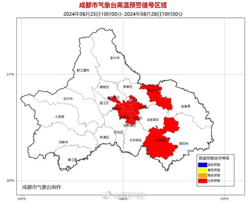 四川发布客户端消息 据@成都气象,成都市气象台2024年08月25日10时00分继续发布高温红色预警信号:预计成都市武侯区、锦江区、青羊区、成华区、金牛区、高新南区、高新西区和青白江区的所有镇(街道)未来24小时内最高气温将升至37℃以上,东部新区的所有镇(街道)未来24小时内最高气温将升至40℃以上。高温时段主要出现在今日11时至19时。请注意防范。