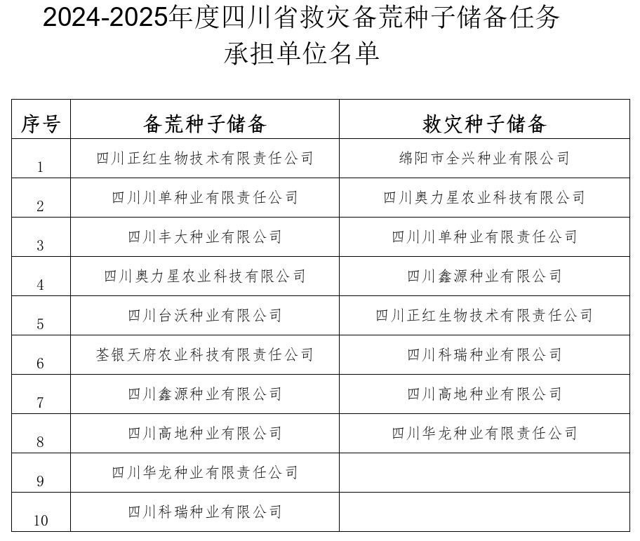 四川发布客户端消息 记者从四川省农业农村厅网站获悉,日前,四川省农业农村厅公示2024-2025年度四川省救灾备荒种子储备任务承担单位名单,拟由四川正红生物技术有限责任公司、四川川单种业有限责任公司、四川丰大种业有限公司、四川奥力星农业科技有限公司、四川台沃种业有限公司、荃银天府农业科技有限责任公司、四川鑫源种业有限公司、四川高地种业有限公司、四川华龙种业有限责任公司和四川科瑞种业有限公司等10家单位承担备荒种子储备任务,拟由绵阳市全兴种业有限公司、四川奥力星农业科技有限公司、四川川单种业有限责任公司、四川鑫源种业有限公司、四川正红生物技术有限责任公司、四川科瑞种业有限公司、四川高地种业有限公司和四川华龙种业有限责任公司等8家公司承担救灾种子储备任务。