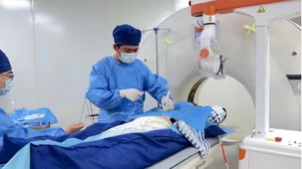 2024年8月11日,手术进行,首先将CT扫描实时数据导入穿刺导航机器人,并在机器人上规划预设好穿刺路径,通过呼吸门控技术过滤掉患者自主呼吸的影响,然后在机械臂红外激光的引导下进行穿刺,穿刺成功后行射频消融治疗。
