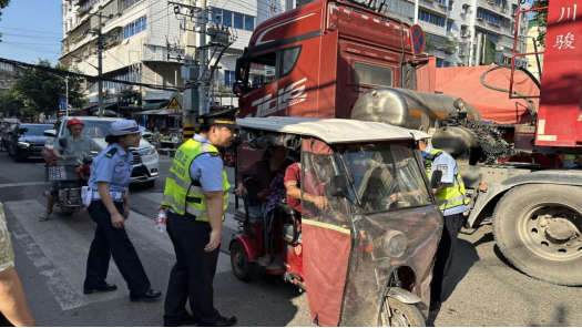 在简阳市三星镇热闹的集市上,人声鼎沸,车流不息。简阳市交通运输局联合市交警大队、综合执法局、镇(街)及辖区派出所在三星镇、雷家镇、镇金镇、平泉街道等4个镇(街),开展机(电)三、四轮车非法载客专项整治联合统一行动正在进行。