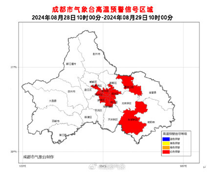 四川发布客户端消息 今日,从成都气象官微获悉,成都市气象台2024年8月28日10时00分继续发布高温红色预警信号:预计成都市武侯区、锦江区、青羊区、成华区、金牛区、高新南区、高新西区和青白江区的所有镇(街道)未来24小时内最高气温将升至37℃以上,东部新区的所有镇(街道)未来24小时内最高气温将升至40℃以上。高温时段主要出现在今日11时至19时。请注意防范。
