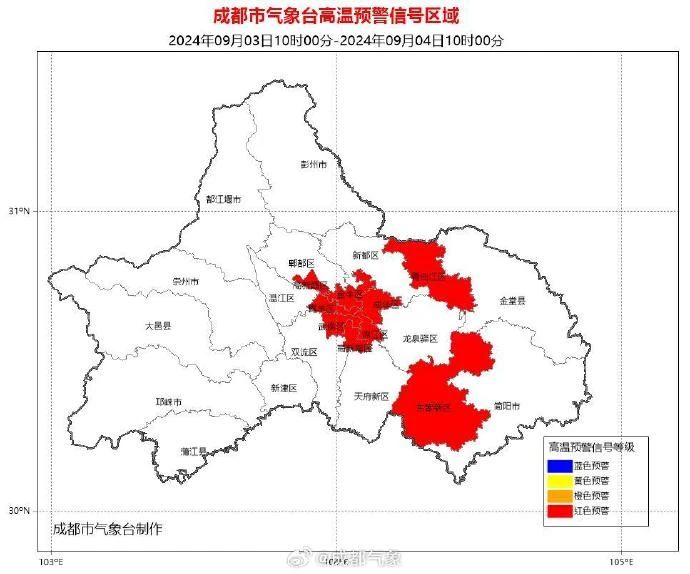 成都市气象台2024年9月3日10时00分继续发布高温红色预警信号:预计成都市武侯区、锦江区、青羊区、成华区、金牛区、高新南区、高新西区和青白江区的所有镇(街道)未来24小时内最高气温将升至37℃以上,成都东部新区的大部分镇(街道)未来24小时内最高气温将升至40℃以上。高温时段主要出现在今日11时至19时。请注意防范。