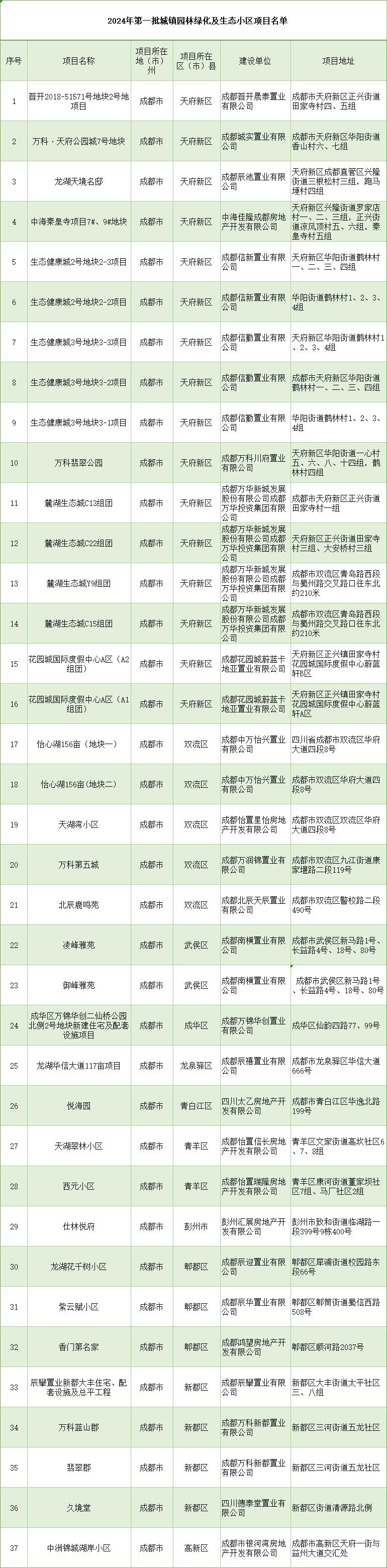 记者从四川省住房和城乡建设厅网站获悉,9月4日,四川省住房和城乡建设厅公布2024年第一批城镇园林绿化及生态小区项目名单,共37个项目入选。