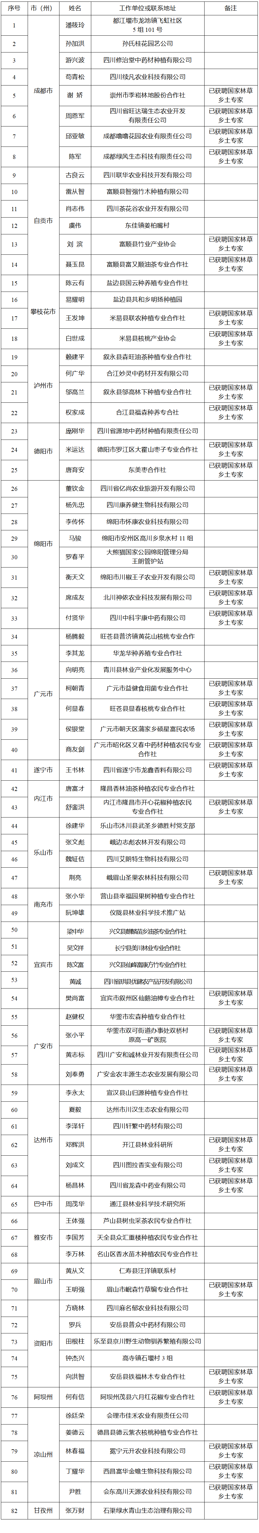 四川发布客户端消息 记者从四川省林业和草原局网站获悉,四川省林业和草原局拟聘任潘筱玲等82名同志(含本次申报入选的47名以及已获聘国家林草乡土专家的35名)为第一批四川省林草乡土专家。公示期为2024年9月4日至9月10日,共5个工作日。