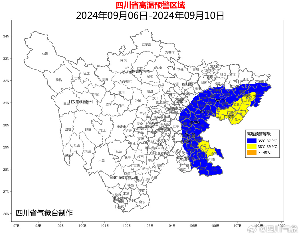 四川发布客户端消息 四川省气象台9月5日15时40分发布高温蓝色预警:预计9月6—10日,达州、广安、南充、遂宁、资阳、内江、自贡、泸州8市及巴中南部、宜宾东部日最高气温可达35—37℃,局部可达38℃或以上。