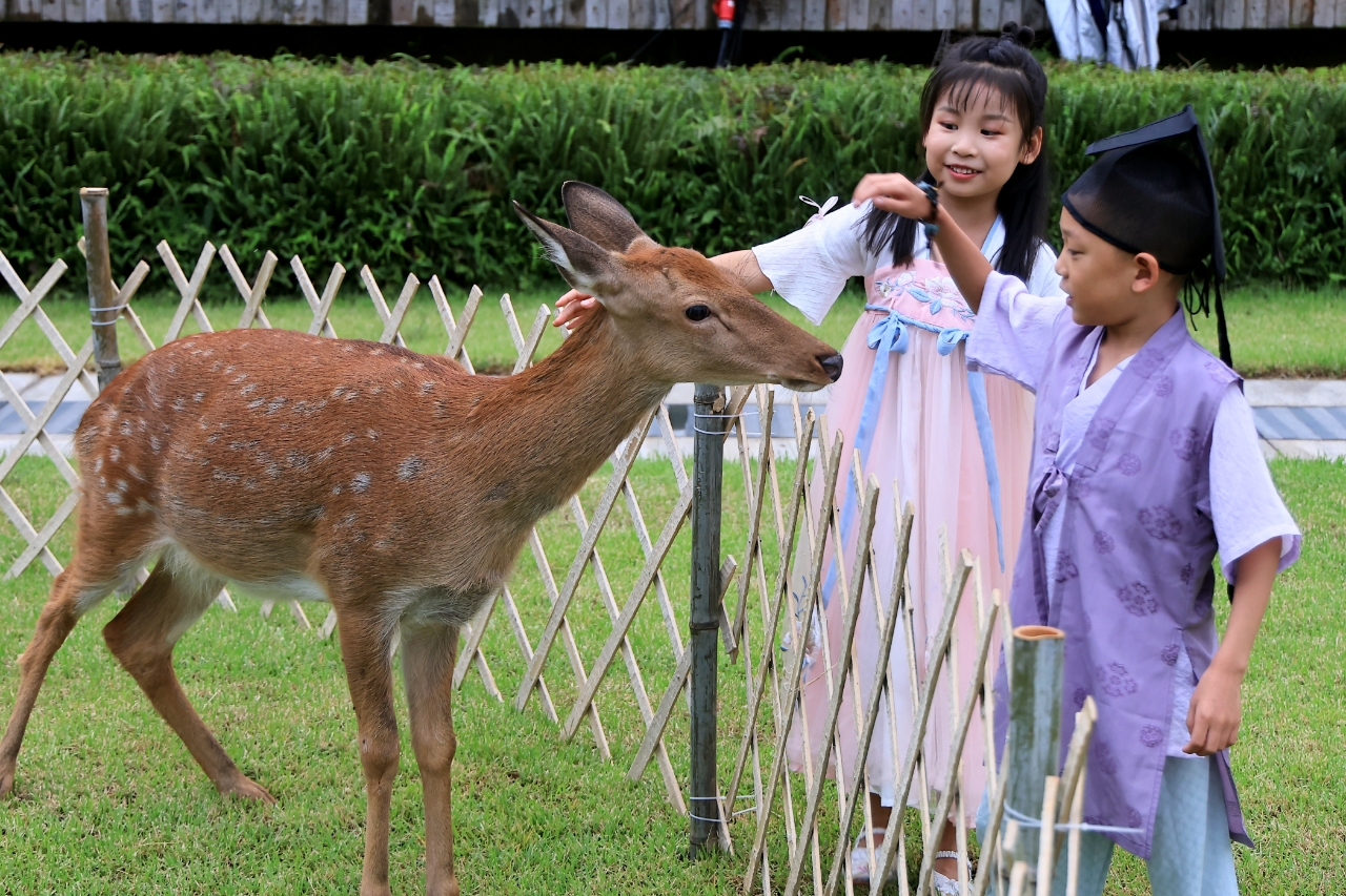 巨大的圆月、可爱的萌兔、国风元素的灯笼……走进金沙遗址博物馆,跟随沿途花灯的指引,像进入了梦幻、浪漫的光影世界。走过月色与竹影掩映的草坪,还能与两只可爱的梅花鹿相遇。它们悠然自得的美好景象,仿佛将观众的思绪带回了那个“呦呦鹿鸣”的金沙王国,为整场诗会增添了几分生动的野趣。