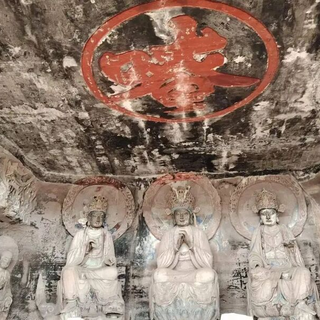 正壁坐高五点二米的“华严三圣”像,中为毗卢遮那佛、左右是文殊、普贤二菩萨。
