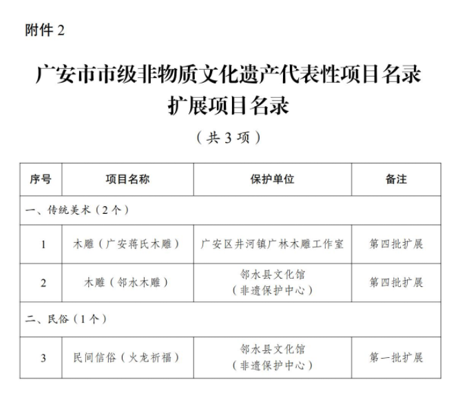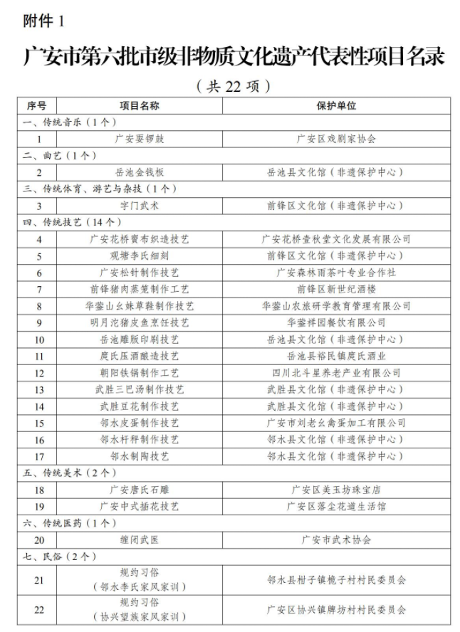 近日 广安市人民政府公布了 第六批市级非物质文化遗产代表性项目名录 涉及传统音乐、传统技艺等20余项 来看看具体名单 ↓↓↓