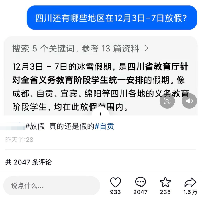 其中一条热帖的截图显示,某AI对话的回答看着十分有模有样,称四川义务教育阶段学生即将在2025年12月3日至7日(周三至周日)迎来“冰雪假期”,并称这是由四川省教育厅针对全省义务教育阶段学生统一安排的。