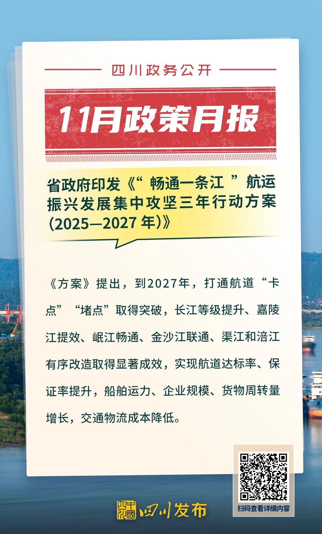 四川发布客户端消息 四川省人民政府2025年11月出台了多项重要政策。其中,涉及“畅通一条江”航运振兴发展、“高效办成一件事”重点事项常态化推进、加快提升农业社会化服务水平、逐步推行免费学前教育、遏制与防治艾滋病、民兵权益保障和优待办法等重要方面。