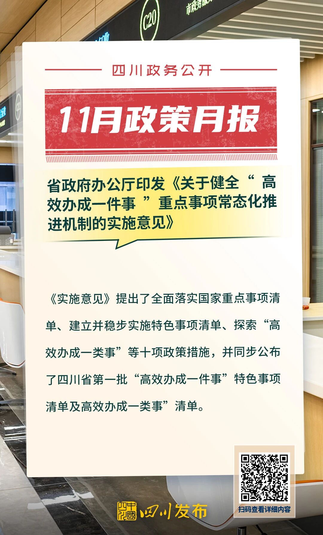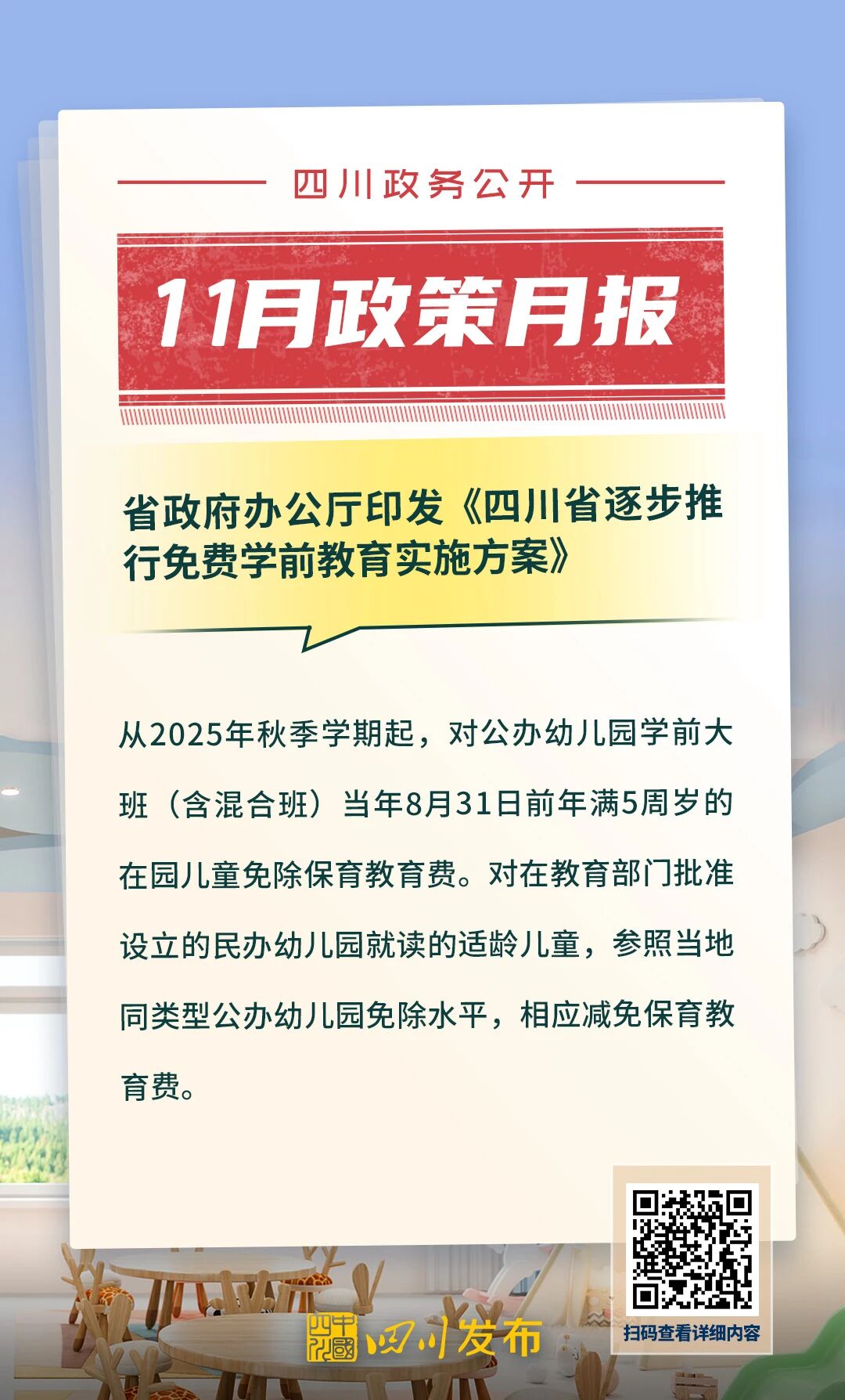 四川发布客户端消息 四川省人民政府2025年11月出台了多项重要政策。其中,涉及“畅通一条江”航运振兴发展、“高效办成一件事”重点事项常态化推进、加快提升农业社会化服务水平、逐步推行免费学前教育、遏制与防治艾滋病、民兵权益保障和优待办法等重要方面。 一起来看 ↓↓↓ 制图|蒋雨洁