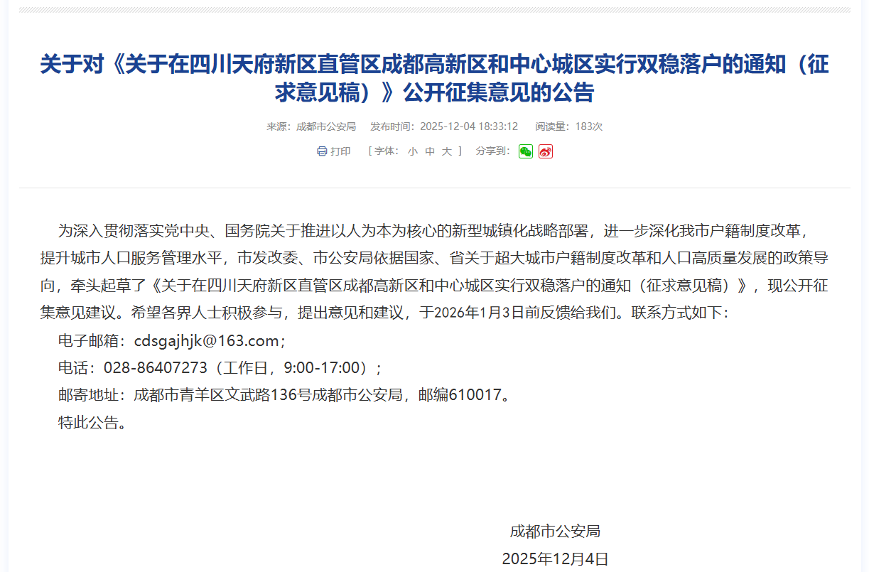 为深入贯彻落实党中央、国务院关于推进以人为本为核心的新型城镇化战略部署,进一步深化我市户籍制度改革,提升城市人口服务管理水平,市发改委、市公安局依据国家、省关于超大城市户籍制度改革和人口高质量发展的政策导向,牵头起草了《关于在四川天府新区直管区成都高新区和中心城区实行双稳落户的通知(征求意见稿)》,现公开征集意见建议。希望各界人士积极参与,提出意见和建议,于2026年1月3日前反馈给我们。联系方式如下:
