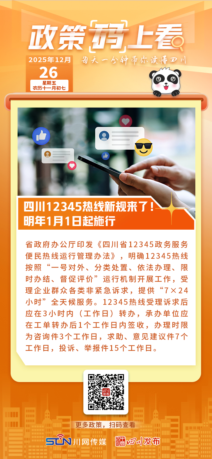 四川发布客户端消息 今后在四川打12345热线,办事将更顺畅、结果将更有保障!近日,省政府办公厅印发《四川省12345政务服务便民热线运行管理办法》(以下简称《管理办法》),共8章、32条内容,明确了职责分工、受理范围、运行流程、监督管理等内容,自2026年1月1日起施行,有效期5年。
