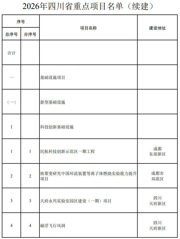 从项目批次看:续建项目526个、2026年预计完成投资5903.1亿元,如磁浮飞行风洞、红外太赫兹自由电子激光装置、乐山机场、眉山洪雅通用机场、成都至达州至万州铁路(四川境内段)、成渝中线铁路(含十陵南站)(四川境内段)、西宁至成都铁路(四川境内段)等项目。计划新开工项目304个、2026年预计完成投资1721.7亿元,如中国聚变能源产业创新基地、成都超级智算中心项目、巴中南江通用机场、新建南充至广安铁路、南江至三台(中江)高速公路、南充至大竹高速公路等等项目。