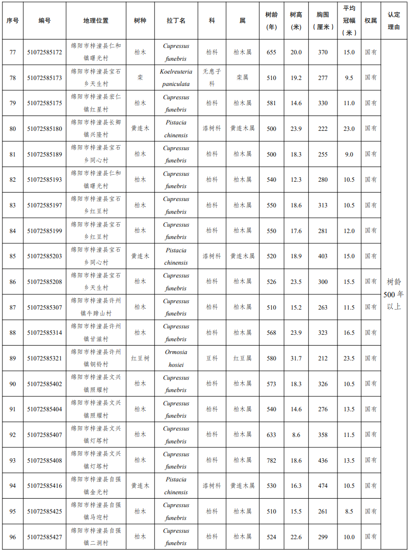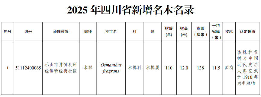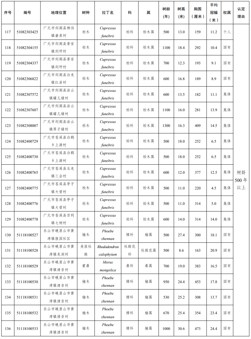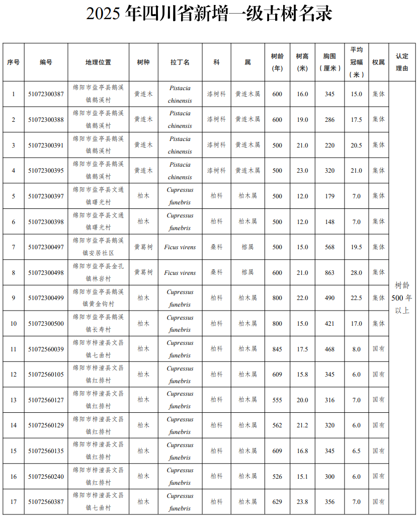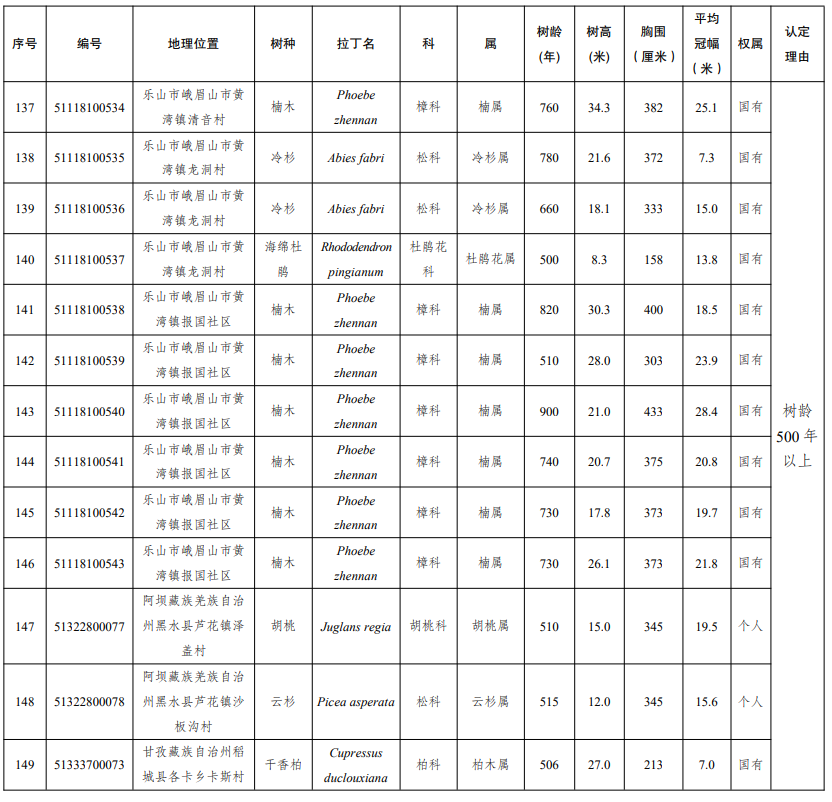 四川发布客户端消息 近日,四川省人民政府发布通告,公布2025年四川省新增一级古树及名木名录。2025年新认定四川省一级古树149株,名木1株。其中,树龄最大的古树为广元市剑阁县涂山镇厚子铺村的柏木,树龄1300年。