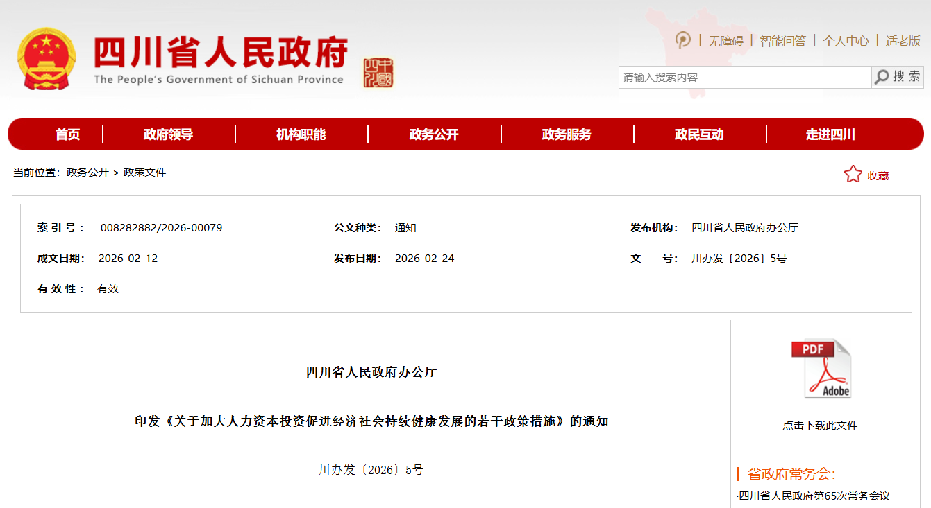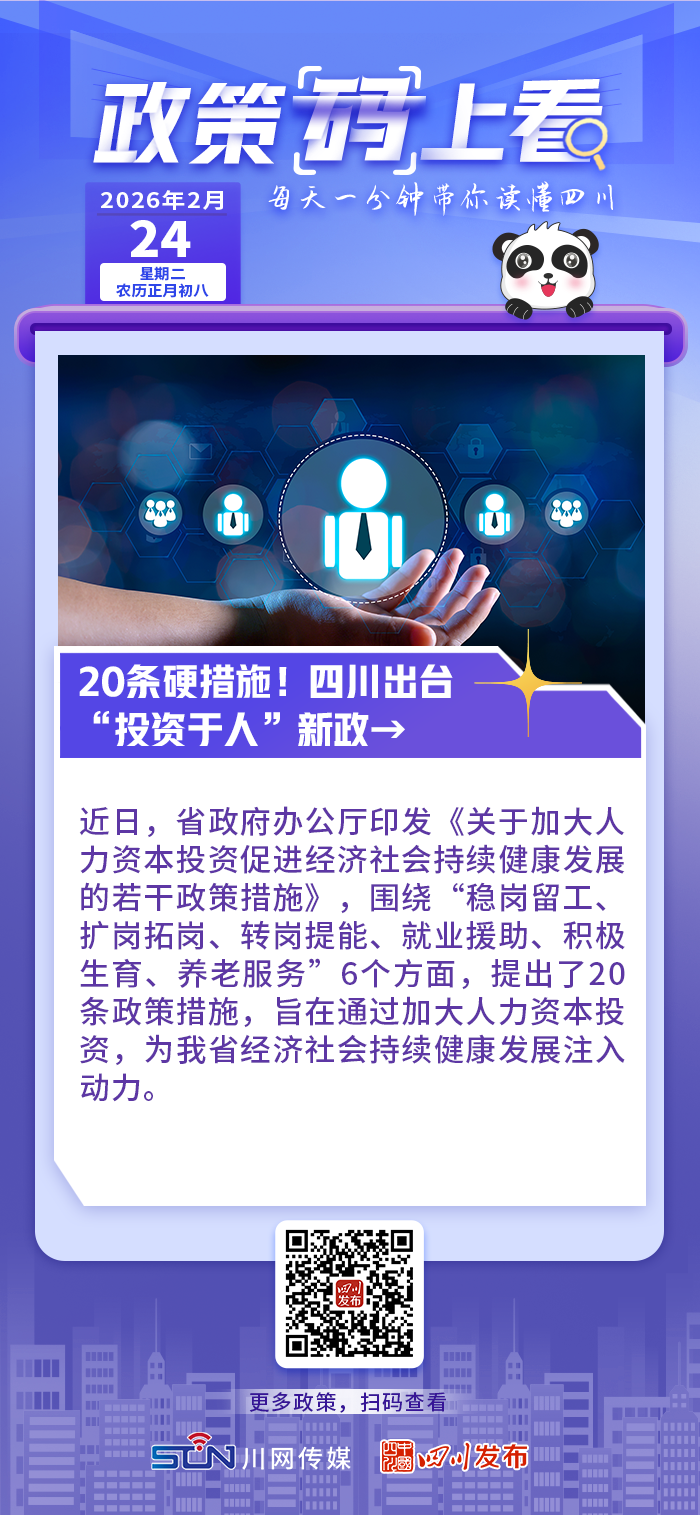 四川发布客户端消息 近日,省政府办公厅印发《关于加大人力资本投资促进经济社会持续健康发展的若干政策措施》(以下简称《政策措施》),围绕“稳岗留工、扩岗拓岗、转岗提能、就业援助、积极生育、养老服务”6个方面,提出了20条政策措施,旨在通过加大人力资本投资,为我省经济社会持续健康发展注入动力。