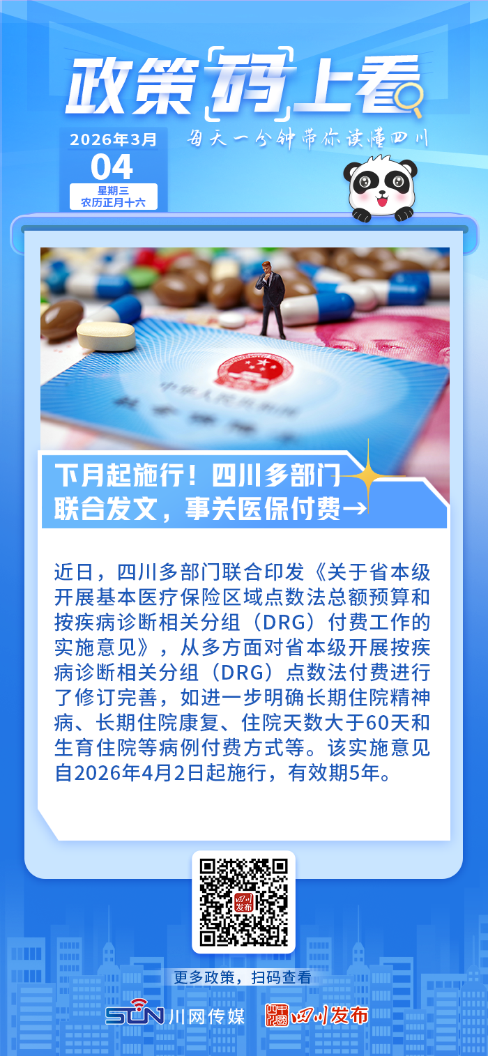 四川发布客户端消息 近日,四川多部门联合印发《关于省本级开展基本医疗保险区域点数法总额预算和按疾病诊断相关分组(DRG)付费工作的实施意见》(以下简称《实施意见》),自2026年4月2日起施行,有效期5年。