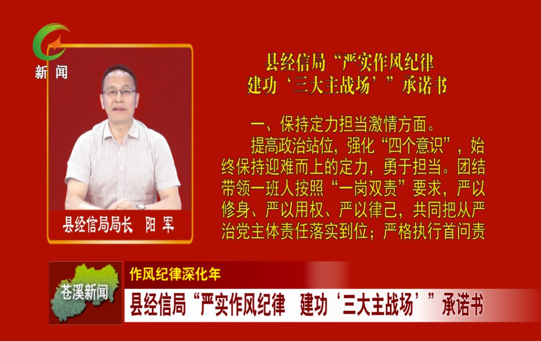为进一步压实党员干部责任意识和担当意识,以严实作风惠民生促发展,将“作风纪律深化年”活动向纵深推进,苍溪开展了“严实作风纪律 建功‘三大主战场’”公开承诺活动。活动以转作风提效能为主线,紧扣“保持定力、敢于担当、满怀激情”“三大主战场”目标任务、“作风纪律深化年”活动3个方面内容,县级部门和乡镇“一把手”陆续在该县电视台、县政府公众信息网向社会公众承诺责任担当、工作成效和工作作风。
