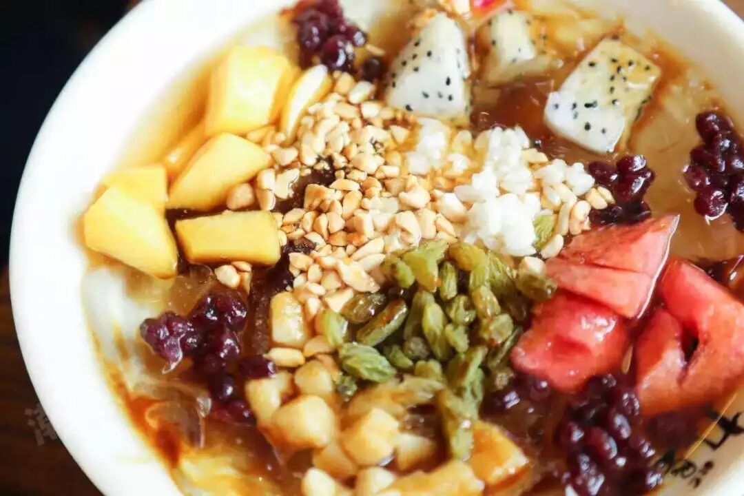 酥脆的花生米、糯糯的葡萄干还有酸甜的山楂干,就着带着红糖的冰粉与冰块化在舌尖上的清凉,11分,多一分不怕它骄傲!在这个炎热的天气,一碗冰粉下肚简直又解渴又降温!