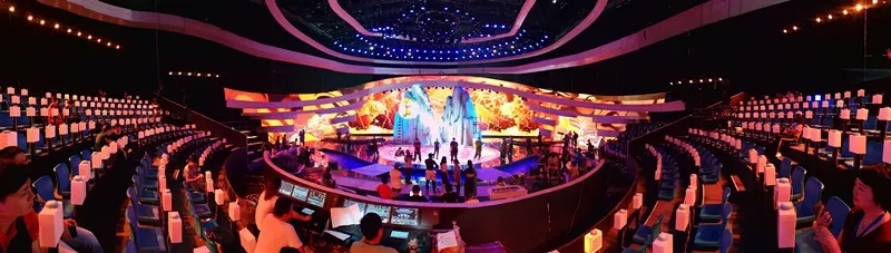 在国家中影数字制作基地5号演播厅入口处,映入眼帘的就是极具广元元素的展板,上面写着“剑门蜀道、女皇故里、绿色广元、康养名都”“四川广元欢迎您”,下面展示了唐家河大熊猫和剑门关景区的整体风貌,让人眼前一亮、倍感亲切。3000平方米的5号演播大厅,格外恢弘大气,舞台搭建、场景布置等准备工作全部结束。