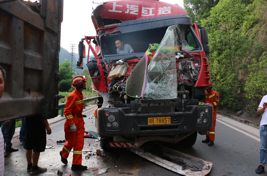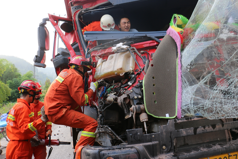 18时20分,救援人员到达现场经现场侦察发现:两辆货车追尾,两货车均不同程度受损,后车前侧受损严重,事故车辆前架完全断裂,挡风玻璃破损剥离,零件也散落的到处,司机腿被卡在驾驶室内无法动弹。现场消防员了解基本情况后,由2名救援人员在做好安全措施的情况下登上驾驶室内部,对被困人员进行安抚,并做好保护;另外一名救援人员利用液压扩张器对挤压部分进行扩张,扩大救援空间,经过20多分钟的紧急救援,消防救援人员将被困司机成功解救,并立即将其移交给在一旁等候的医护人员救治。