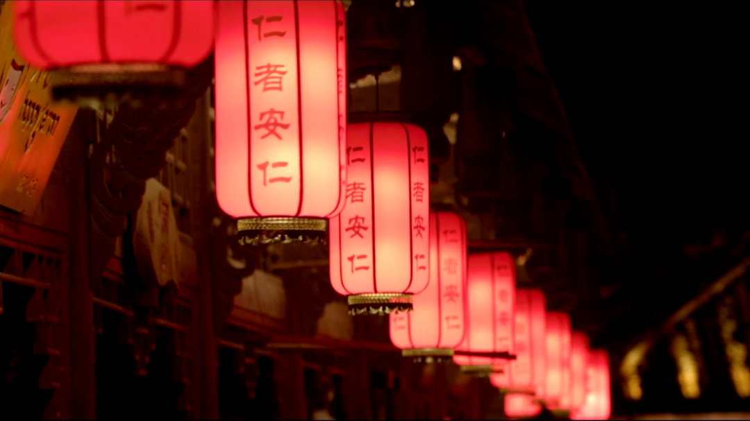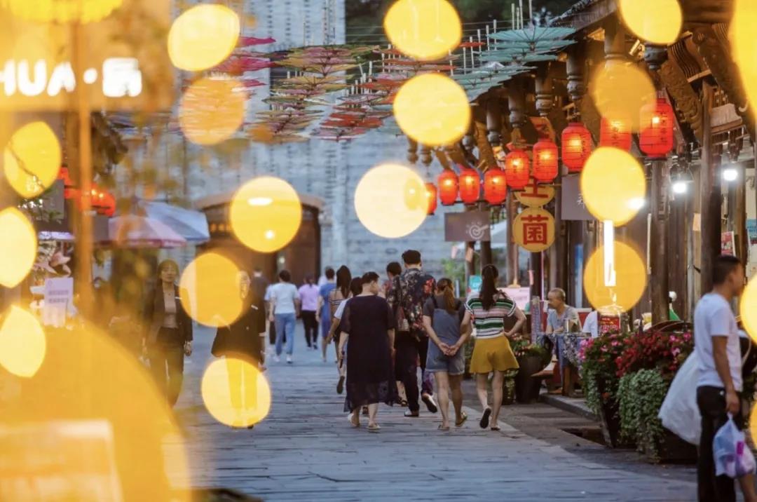 路旁悬挂的盏盏红灯笼,点缀着迷人夜色,造就十里华街
