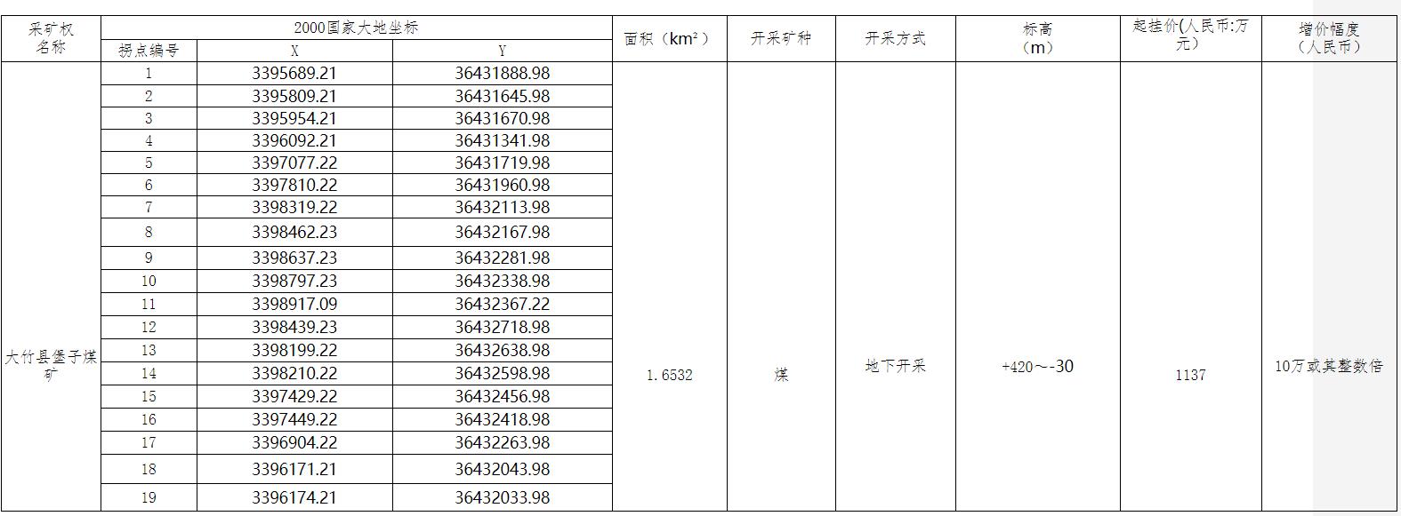 本次出让区块为大竹县堡子煤矿开采区块。本次挂牌按照“已设采矿权已相关资产在客观公允评估的基础上,可以与周边整体规划的同矿种矿产资源统一招标拍卖挂牌出让”的规定进行出让,本次挂牌出让的标的物为扩大矿区范围及原采矿权矿区范围新增查明资源量采矿权。竞得人在竞得标的物后,须与大竹县堡子矿业有限责任公司堡子煤矿(以下简称“堡子煤矿”)签订转让协议,一并受让采矿权及相关资产。