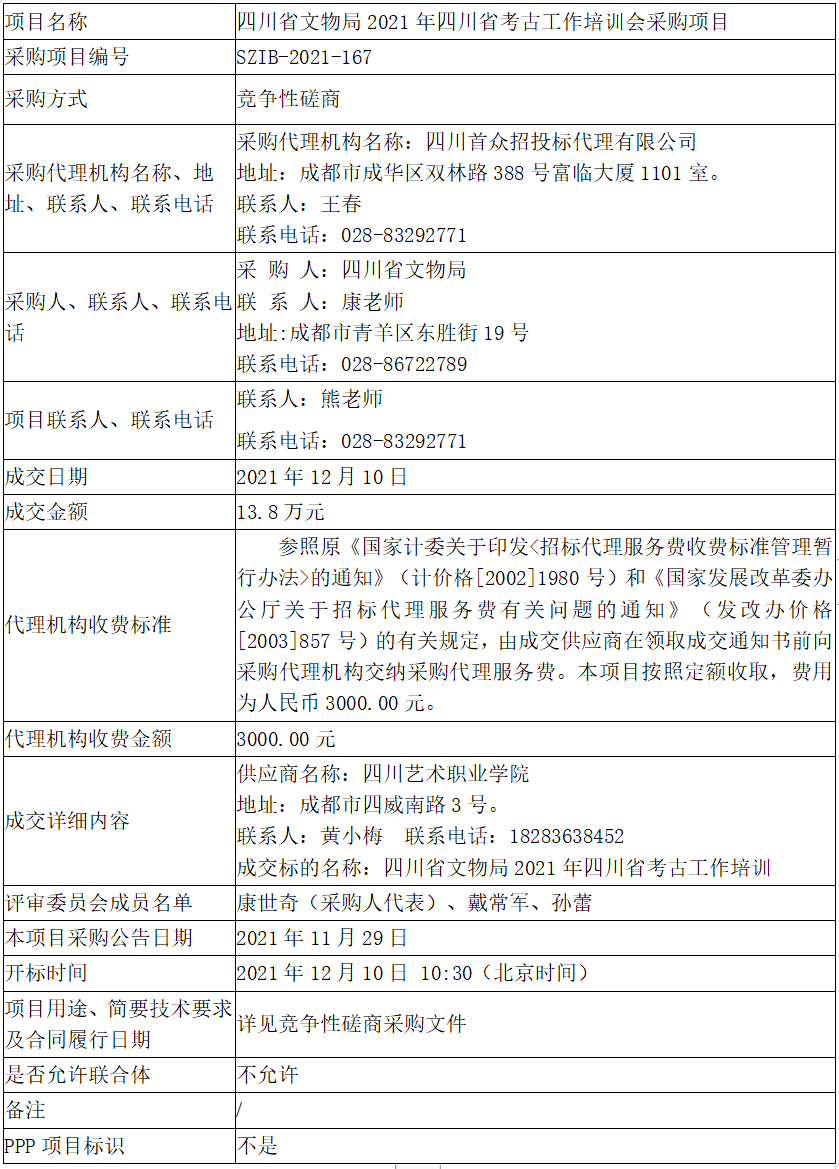 四川省文物局2021年四川省考古工作培训会采购项目成交公告