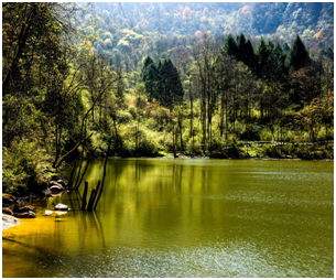 鹿池:游程的起点位于核桃坪山庄,整个游程往返 6 公里,大约需要 1 个小时,到鹿池游览也需乘坐观光车。鹿池位于海拔 2400 米,地处较为平坦的半山腰上,是一个方圆近 10亩的高山湖泊。因野生鹿群时常在这儿休憩、饮水而得名。
