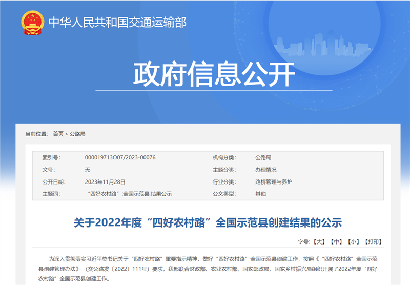 乐山新闻网讯(记者 周柳)11月28日,交通运输部发布《关于2022年度“四好农村路”全国示范县创建结果的公示》。经县级申请、省级核查、专家评审、确定创建单位、评估验收等程序,拟对全国197个县级单位命名为“四好农村路”全国示范县,乐山市井研县上榜。