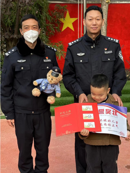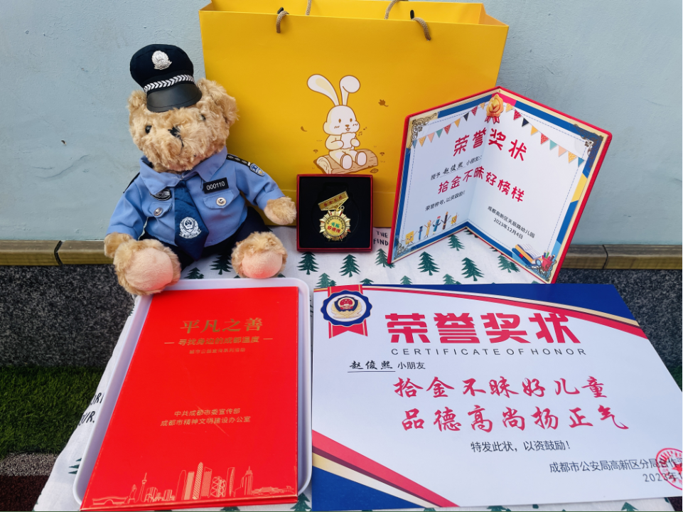 四川发布客户端消息 12月4日,成都高新西区天辰路幼儿园举行了一场特别的升旗仪式。5岁的赵俊熙是现场当之无愧的主角!他胸前别着一枚奖章、手里捧着一张奖状、怀里揣着一只警察小熊,可把身边的小朋友们羡慕坏了!这是为啥呢?