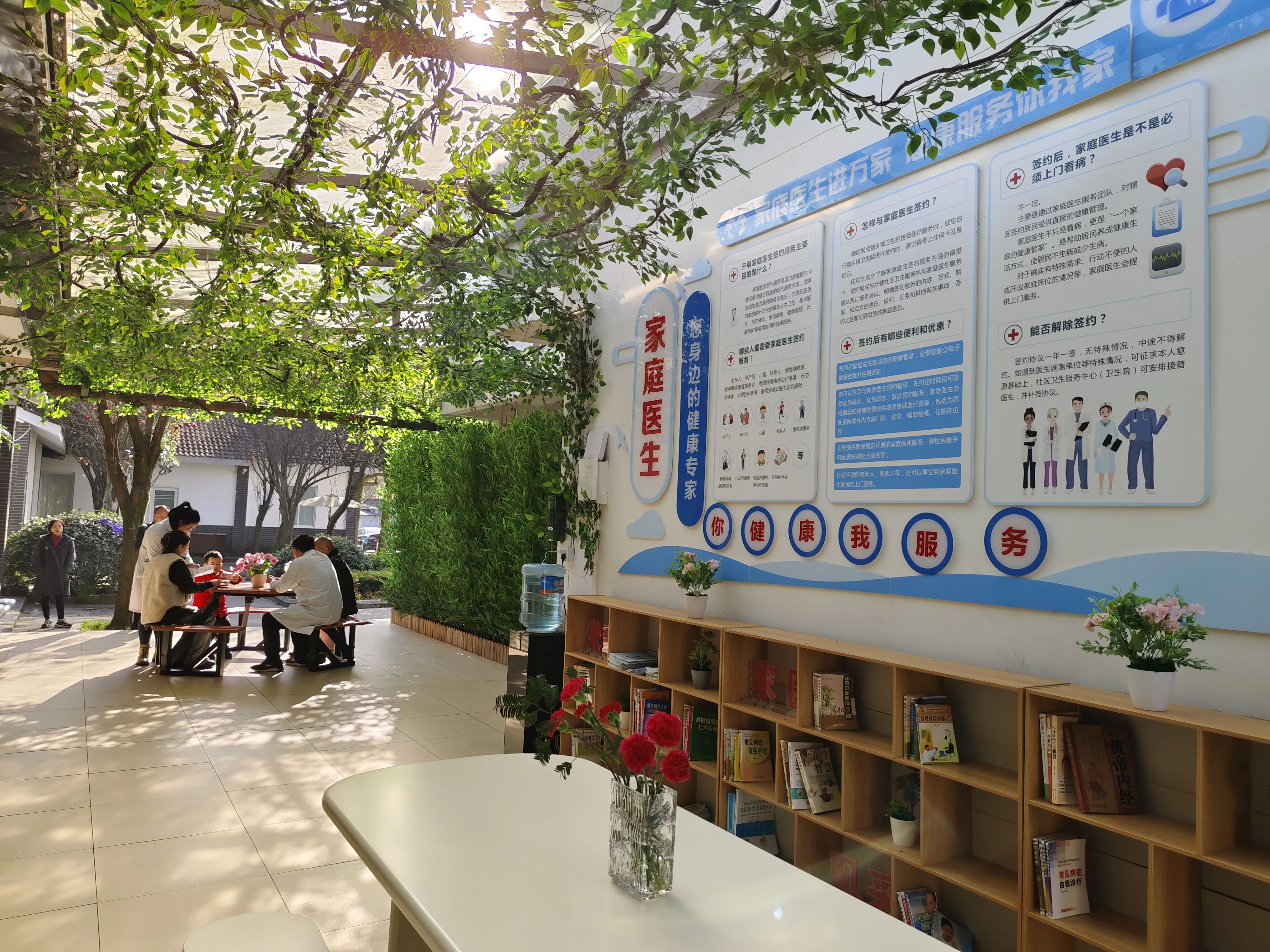 民生无小事,枝叶总关情。绿植藤蔓,竹林银杏,宣教声声,自然景色与人文景观相互交织,一院一景,愉悦身心。走进天马镇中心卫生院新打造的健康文化角,绿藤之下、石凳之上,中医科医生孟基礼、公卫科护士刘雯正在与等候拿报告的患者及家属交流沟通。一条条惠民政策张贴于宣传墙上,一本本健康宣传册整齐摆放,和煦的阳光穿过藤蔓,好一幅就医美好体验全景图。