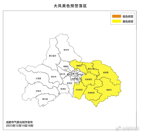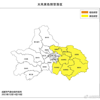 四川发布客户端消息 成都市气象台2023年12月14日16时00分发布大风黄色预警:受北方冷空气影响,14日傍晚前后开始成都普遍有4-6级偏北风,其中新都、青白江、金堂、龙泉驿、天府新区、东部新区、简阳的部分地方风力可达7级或以上。请注意防范。