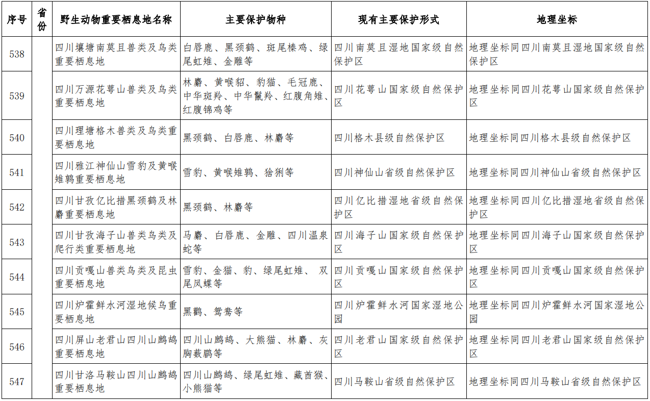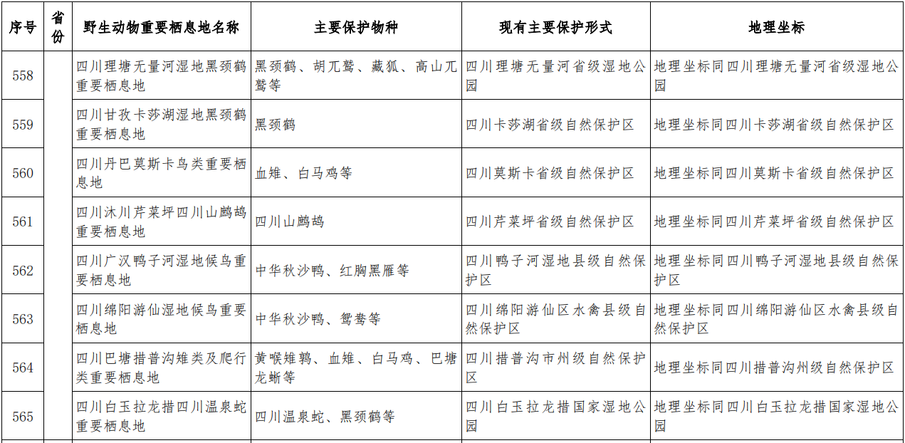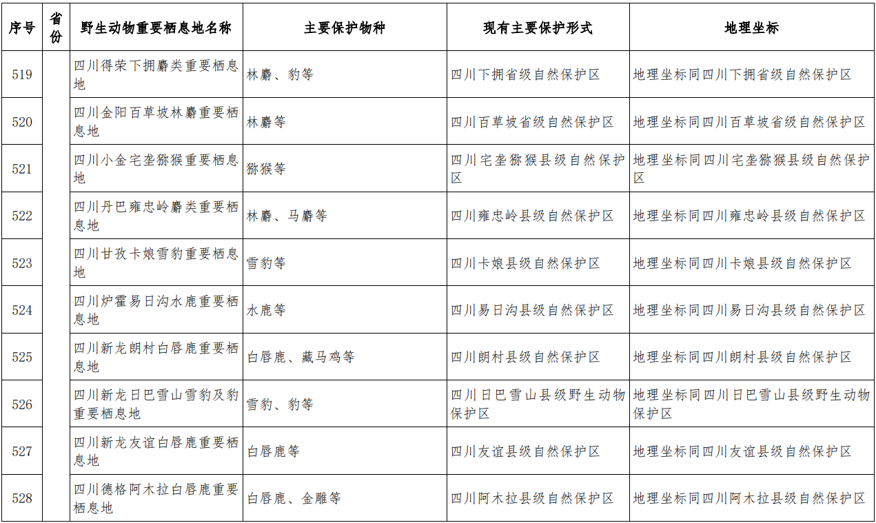 四川发布客户端消息 国家林草局官网发布了第一批陆生野生动物重要栖息地名录,四川74地入选。据悉,首批陆生野生动物重要栖息地共分为珍贵濒危物种生存繁衍区域、野生动物集群分布区域等六类,涉及31个省区市,覆盖了565种国家一、二级重点保护野生动物的栖息地、繁衍地、迁飞地,包括兽类127种、鸟类339种、两栖爬行类62种、昆虫37种。