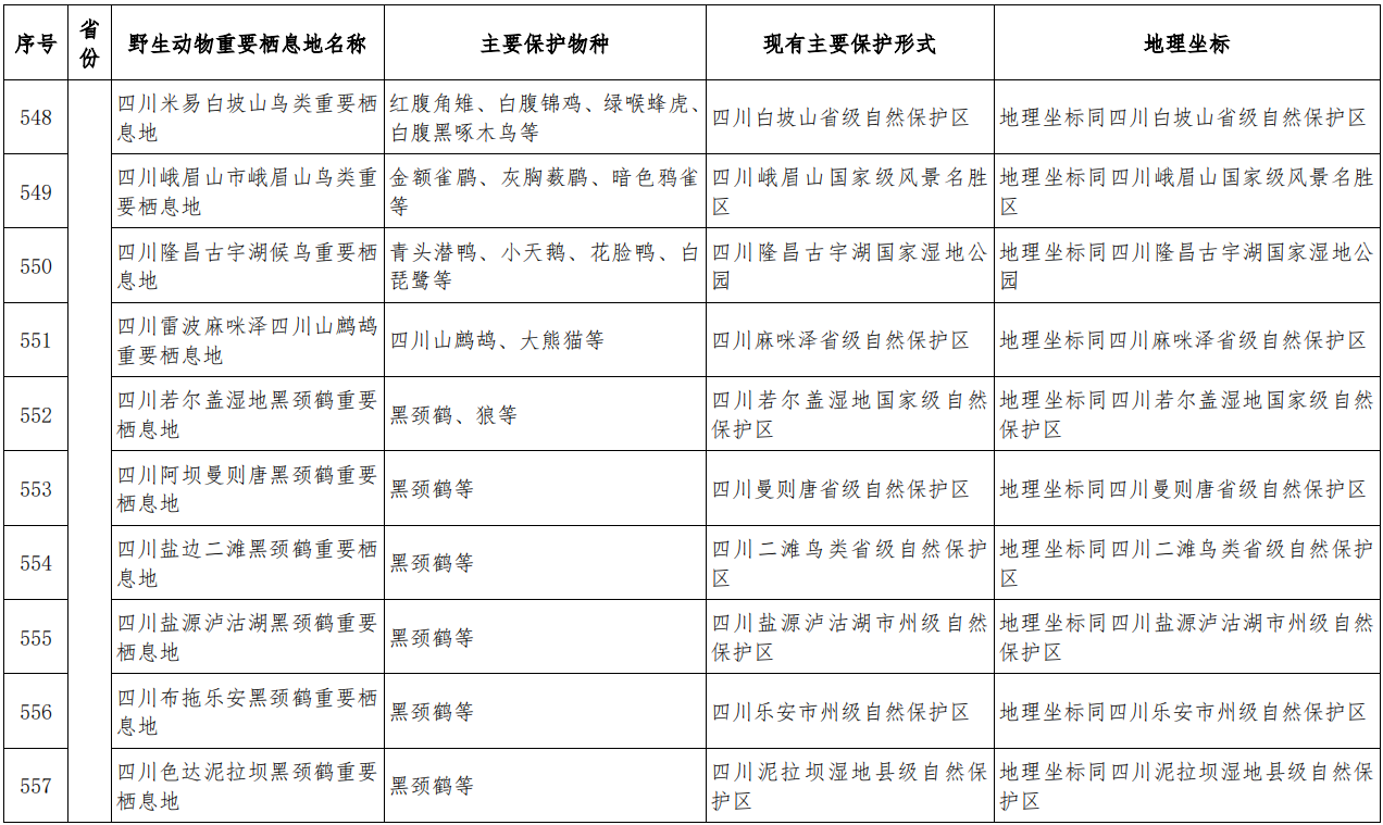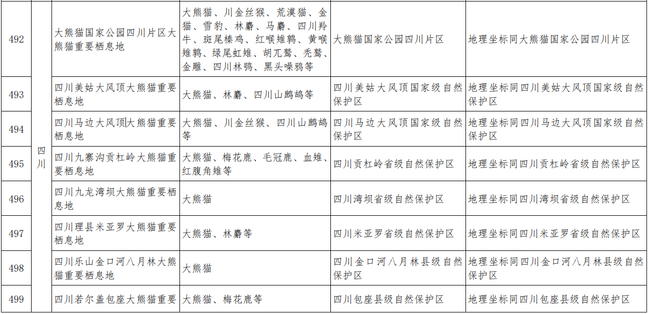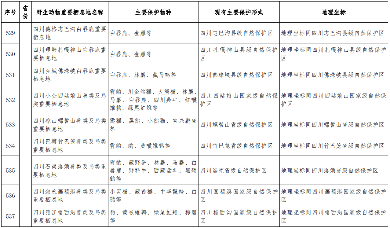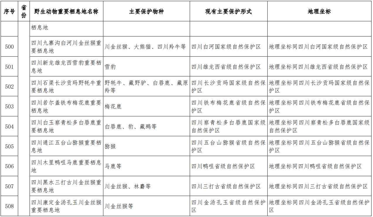 四川发布客户端消息 国家林草局官网发布了第一批陆生野生动物重要栖息地名录,四川74地入选。据悉,首批陆生野生动物重要栖息地共分为珍贵濒危物种生存繁衍区域、野生动物集群分布区域等六类,涉及31个省区市,覆盖了565种国家一、二级重点保护野生动物的栖息地、繁衍地、迁飞地,包括兽类127种、鸟类339种、两栖爬行类62种、昆虫37种。