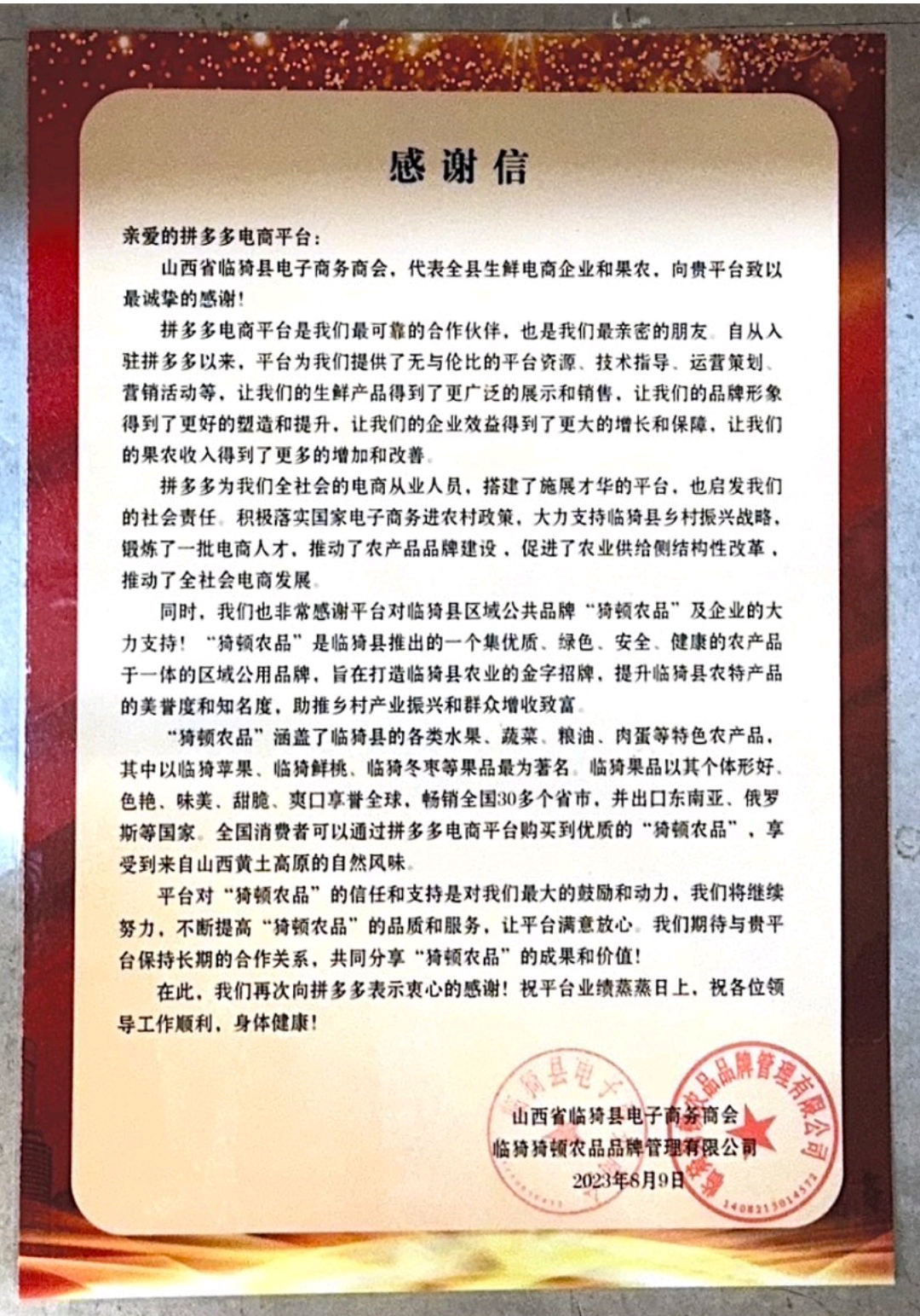 临猗电子商务商会给拼多多的感谢信 受访者供图
