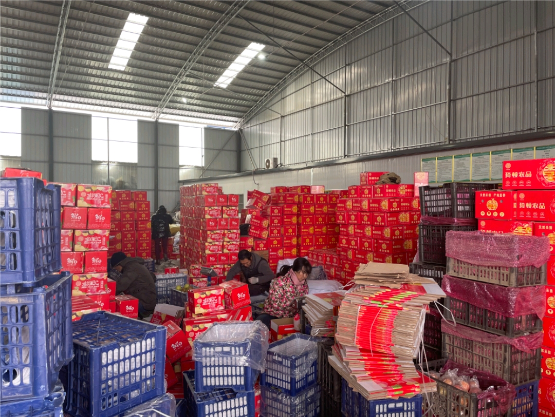 现在,吴娇娇白天没什么事,就来到董晨旭的仓库里帮忙装箱。在临猗县耽子镇陶唐村,董晨旭的拼多多店铺“猗顿农品”有仓库在这儿。仓库门口有卡车等候,工人不停将装好苹果、贴好订单的箱子搬运到车上,搬满一车便离开,不一会儿便有另一辆卡车停在门口,重复刚刚的动作。