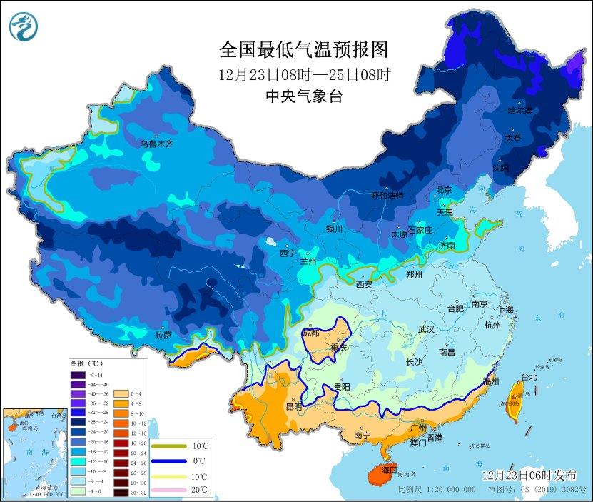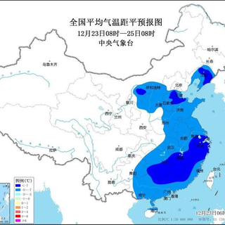 预计,12月23日08时至25日08时,内蒙古河套地区、陕西北部、华北西部和中南部、东北地区南部、黄淮及其以南大部地区日最低气温或平均气温较历史同期偏低5℃以上,其中,内蒙古河套地区、辽宁北部、河北中南部、江南大部、华南北部等地的部分地区偏低7℃以上,最低气温0℃线将位于贵州西南部至华南北部一带 。