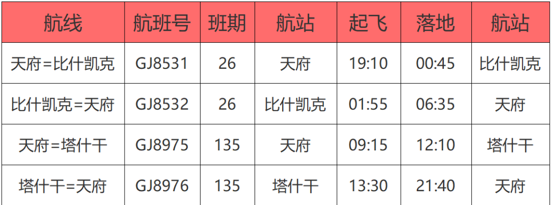 ▲长龙航空优化调整成都天府直飞比什凯克航线航班时刻