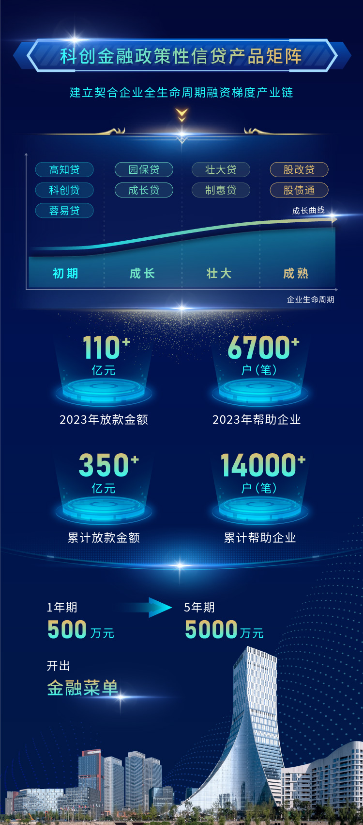 细分对照,每款产品匹配科技企业全生命周期中不同的发展阶段。针对初创企业“资产少、担保弱”的特点,创设“高知贷”;面向“有潜力、有技术优势、成长性较大”的成长期企业,推出“成长贷”“园保贷”;针对发展至成熟阶段的科创企业,打造了金额大、期限长的“壮大贷”“制惠贷”等产品;对于拟上市企业,则推出了中西部首款政策性投贷联动产品“股债通”,通过“股权+债权”新模式赋能科创企业发展,助推企业把握资本市场改革红利,降低企业股改及上市过程中的运营成本。
