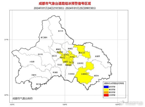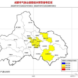 成都市气象台2024年01月24日21时30分继续发布道路结冰黄色预警信号:预计成都锦江区、成华区、青羊区、金牛区、武侯区、高新西区、高新南区、成都东部新区和青白江区的所有镇(街道)未来12小时内可能出现对交通有影响的道路结冰。请注意防范。